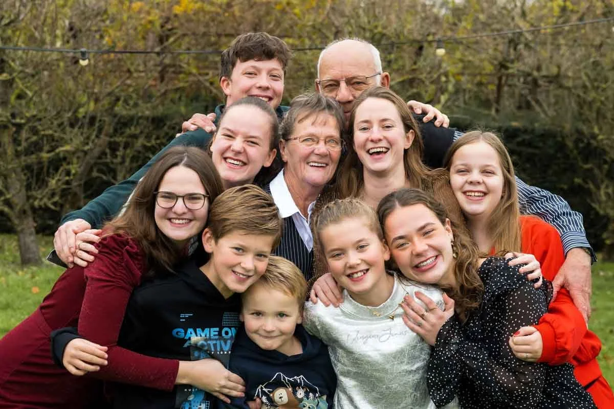 groepsfoto, in spontane setting, opa en oma rennen met al de kleinkinderen.